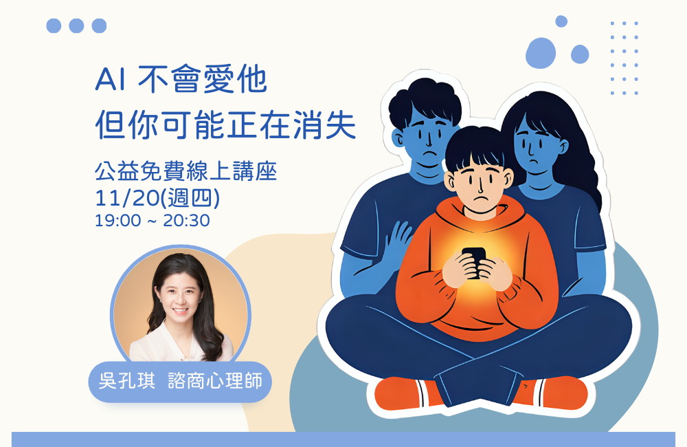 當你願意多為自己安排一點支持(諮商、團體、朋友對話都算), 你就比較有可能在孩子的生命裡,長期而穩定地存在。 AI 不會愛他,但你可以。 而你的愛,真的只有透過關係、透過一次次的靠近,才有機會被感受到。
